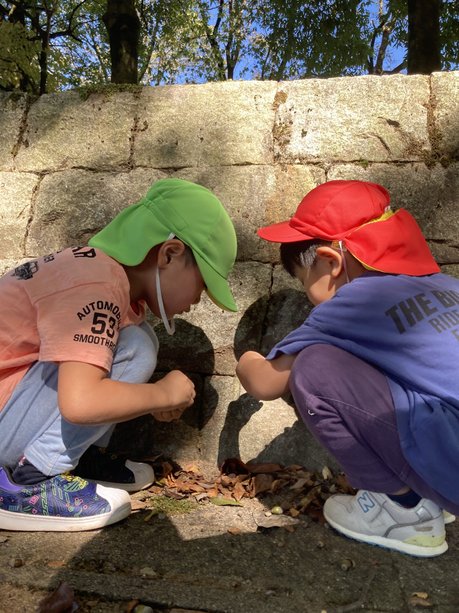 秋の自然をお友達と協力して見つけるゲームを楽しみました。「落ち葉も秋っぽい!」「きのこは秋やけど触っちゃダメよ」とペアを組んでいるお兄さんやお姉さんが教えてくれていました。