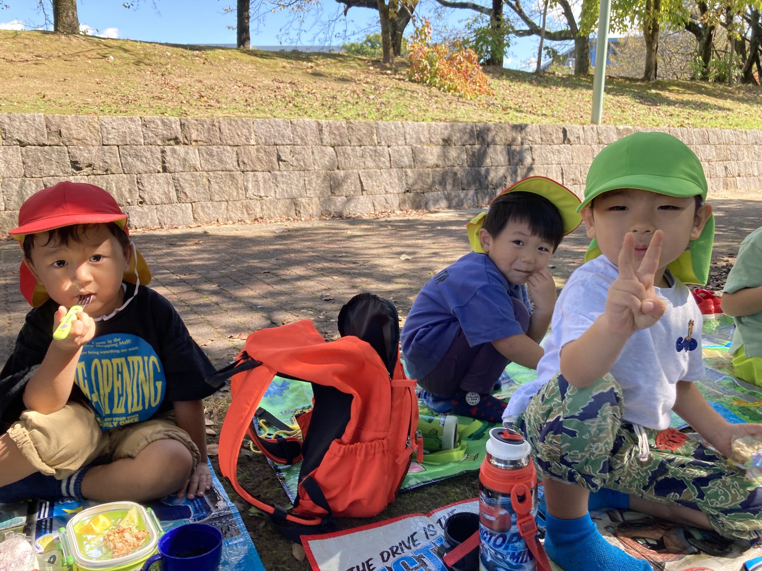 おうちから持ってきているおにぎりと園から届いた給食とをお日様の下でみんなで食べました!
