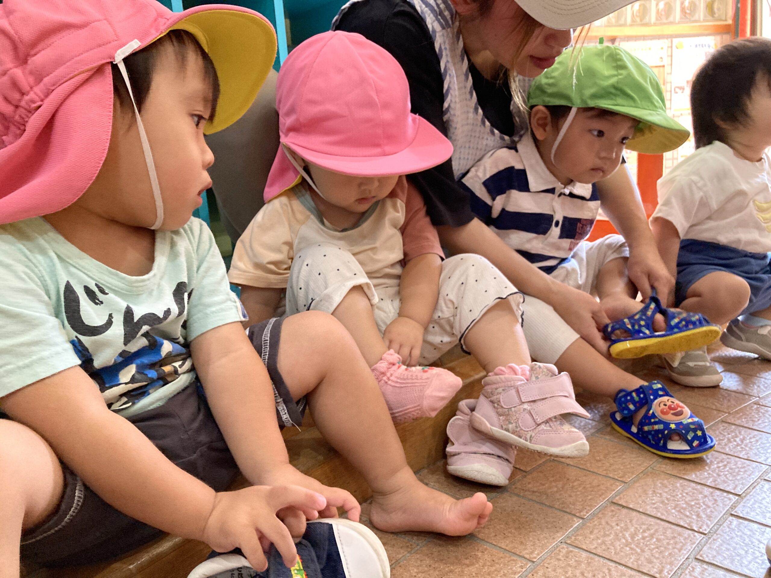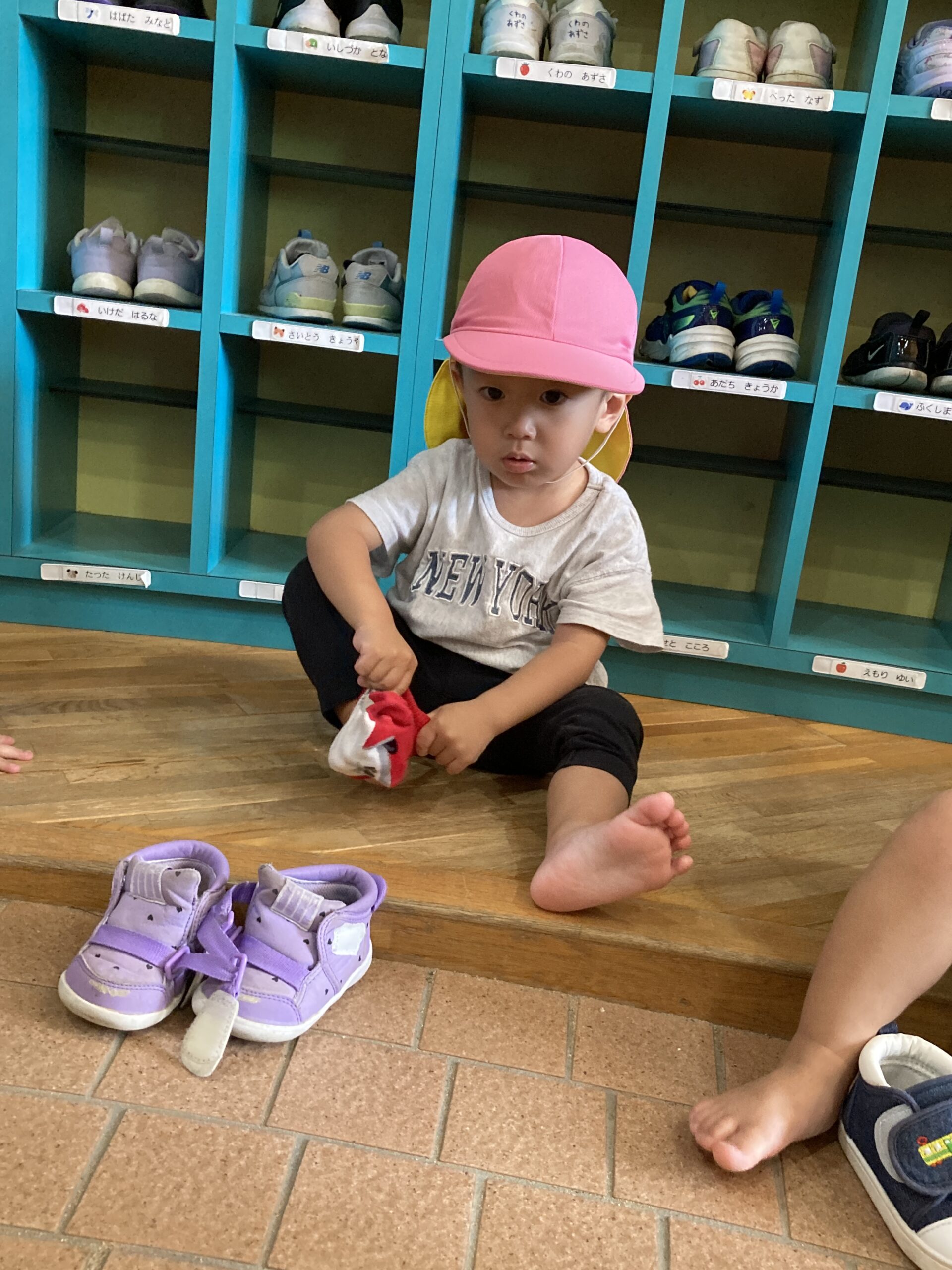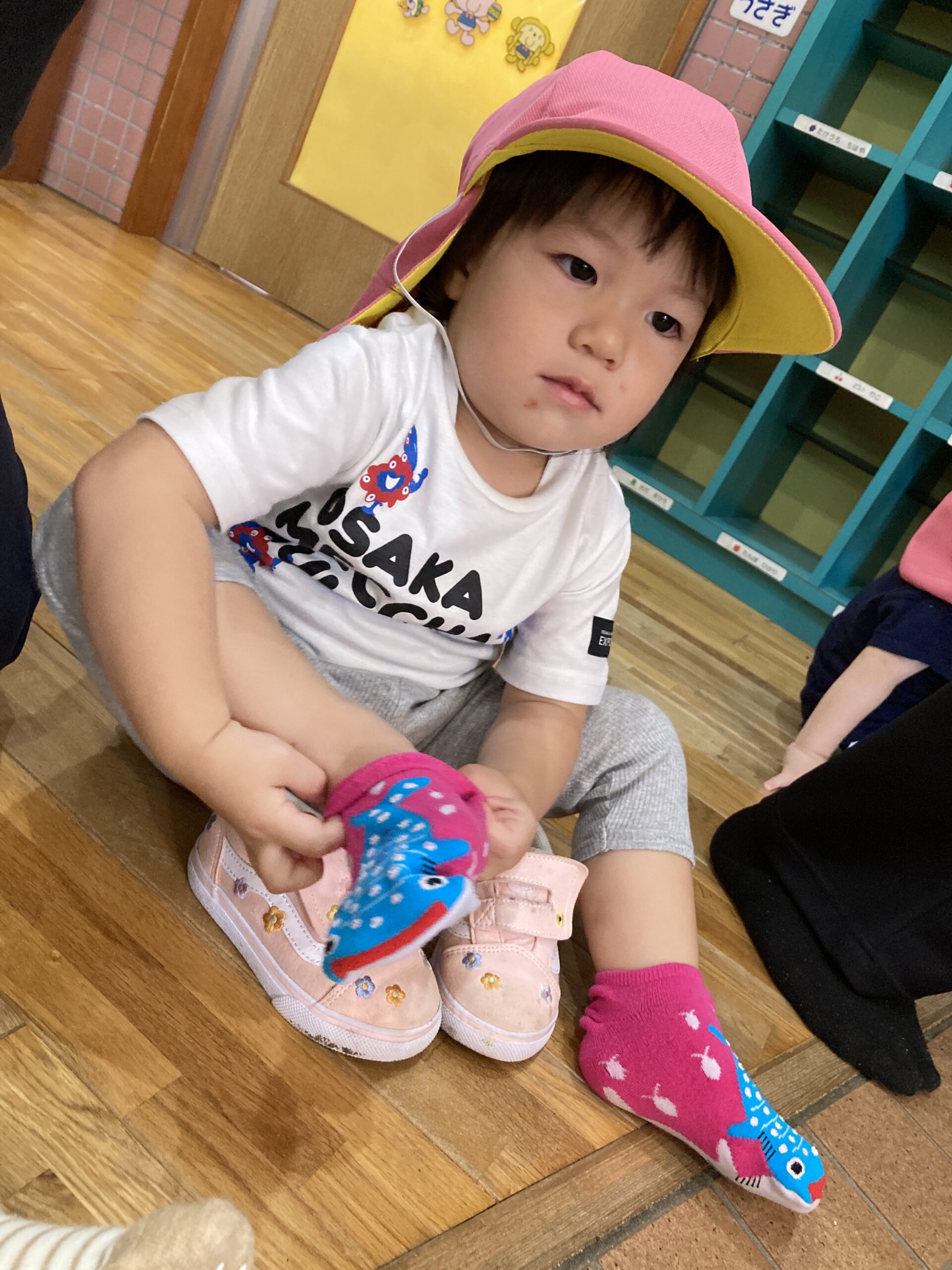 足の指に引っかかったり、うまくいかない事も多いですが、保育者に手伝ってもらいながら、自分で頑張った達成感を味わうことで、次回へのやる気につながります♪