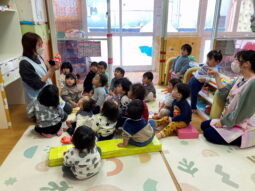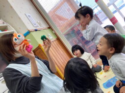 0.1歳児のお友だちはお人形を使って、好き嫌い鬼とかみつき鬼、ひっかき鬼のお話をしました。慣れ親しんでいるぬいぐるみを使ったことで、みんな夢中になって話を聞いていました。