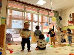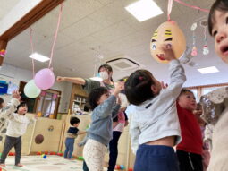その後は、お部屋や小ホールで節分にちなんで、風船の鬼さんの的あてを楽しんだり、小ホールではフープ跳びや波マットで運動遊びを楽しみました。また、手作り衣装を着て気分は小さな鬼さん♪自分で履いてみたり、お友達が穿くのをお手伝いしたりする姿も見られました。