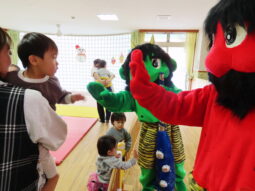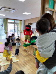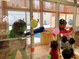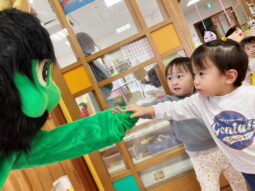 そしていよいよ鬼さん登場!!はじめはテラスから鬼さんが登場しました。「おにはーそと!!」とガラス越しの豆まきを楽しんだ後、子どもたちの様子を見て、小ホールへ遊びに来てもらいました。鬼さんとタッチをしたり、先生と一緒にタッチをしたり、遠くから見つめたりと個々の距離感で、鬼さんと触れ合う姿が見られました。