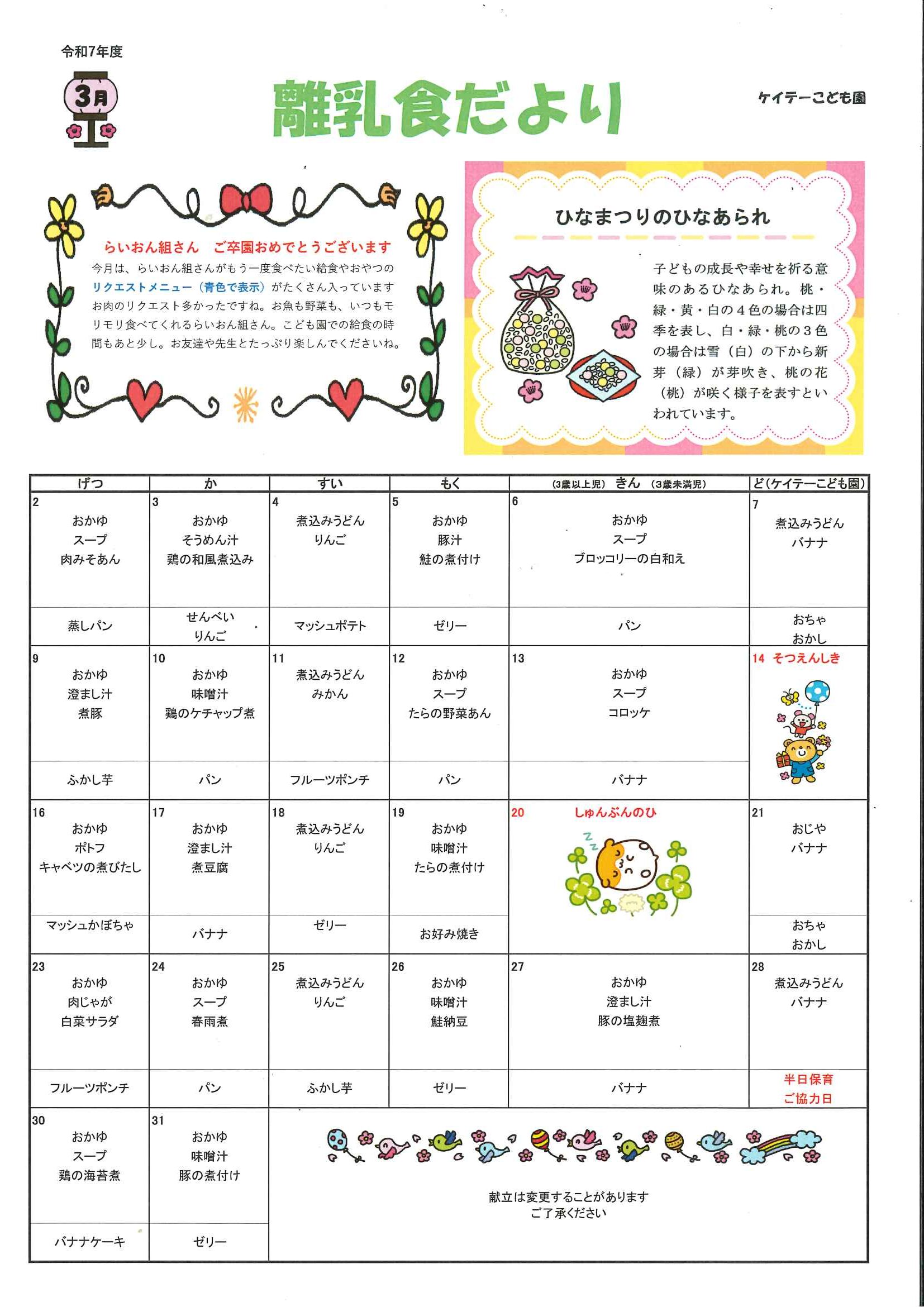 3月 きゅうしょくだより
